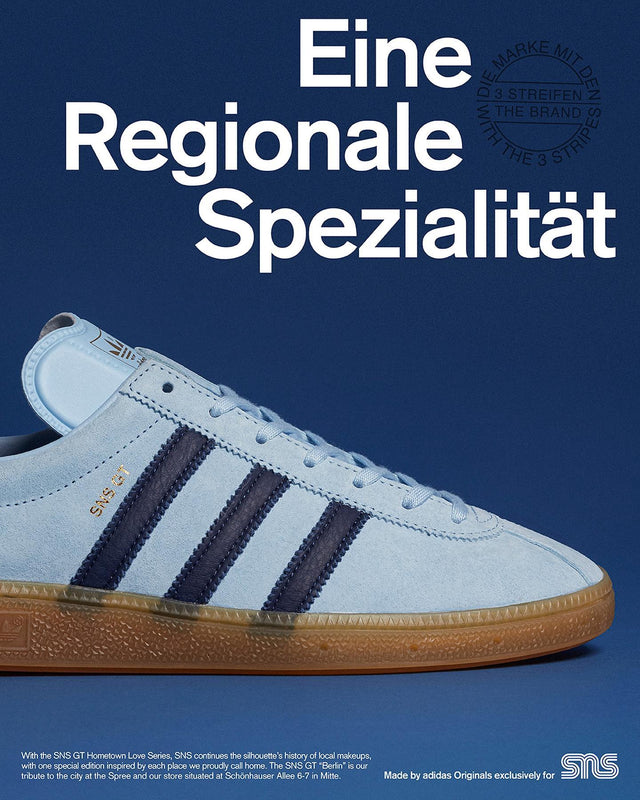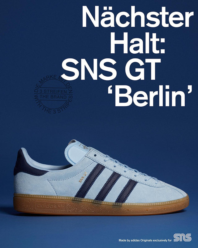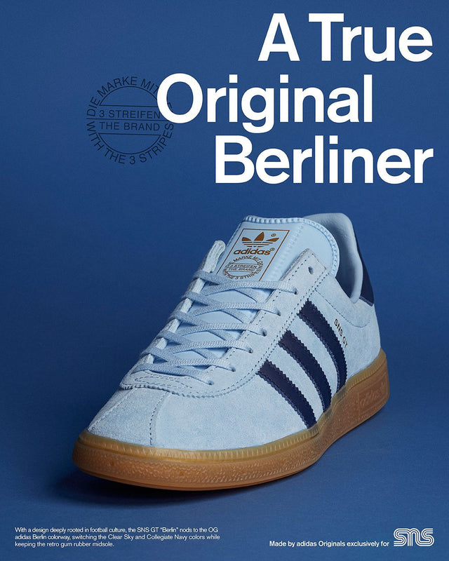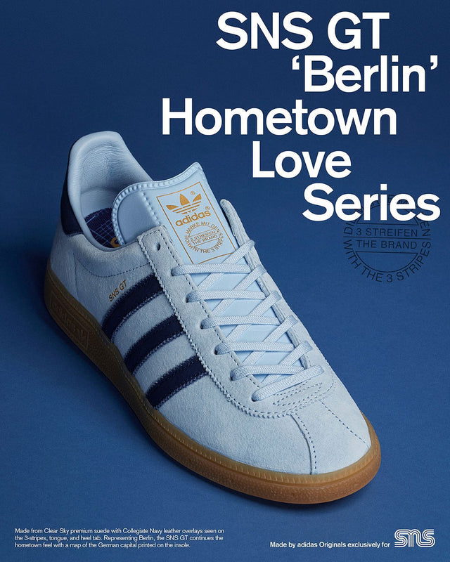 Based on a shoe first released in 1980 called the “Stockholm GT” and first-ever re-released as SNS GT “Stockholm,” “London,” and “Paris,” SNS continues the Hometown Love Series with a nod to Germany’s capital. The SNS GT “Berlin” is a throwback to the days when fans from the United Kingdom followed their team throughout Europe. While visiting Berlin and watching football was a unique chance back in the days for fans from the island, the SNS GT "Berlin" tells the story of an original "Berliner." With a design deeply rooted in football culture, the colorway nods to the OG adidas Berlin colorway, switching the Clear Sky and Collegiate Navy colors while keeping the retro gum rubber midsole. Made from premium suede with leather overlays seen on the 3-stripes, tongue, and heel tab, the low-top trainer features a map of the German capital printed on the insole as a tribute to the city at the Spree and our Store situated at Schönhauser Allee 6-7 in Mitte.