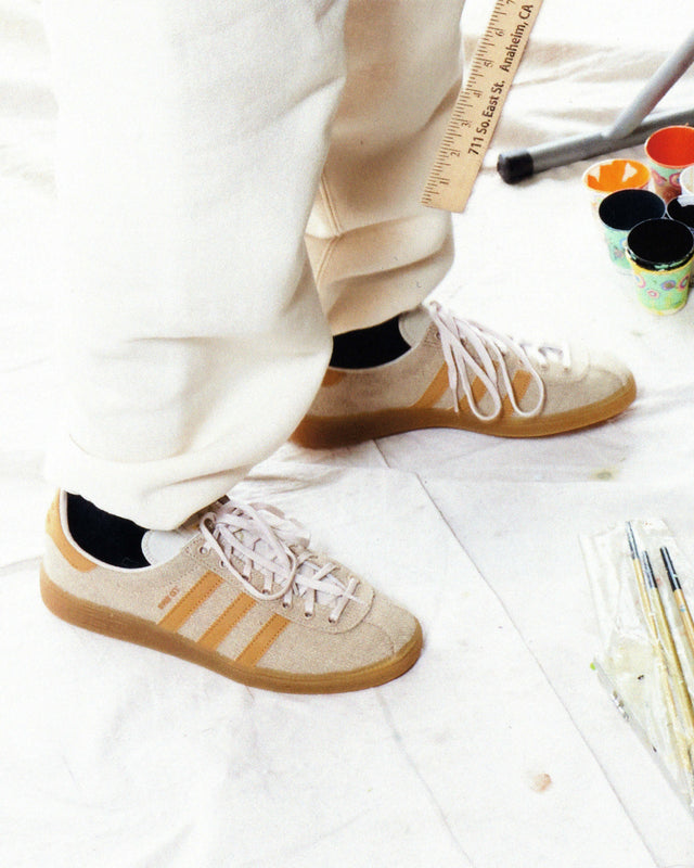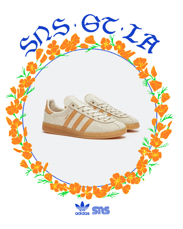 The adidas Originals SNS GT "LA" continues to tell the story of the original "Stockholm GT" shoe from 1980, a collectible sneaker gem that was re-introduced by SNS and is now taking it all the way to Los Angeles, paying homage to the City of Angels. Constructed with a hemp canvas upper and faux suede on the stripes and backtab, the retro silhouette's design nods to Venice Beach, SNS' home on the West Coast and the second location in the USA. The GT version is equipped with a brown colorway with Mesa-colored accents and metallic gold highlights, offering a gum rubber Handball Spezial outsole fusing archival innovation with a modern update.