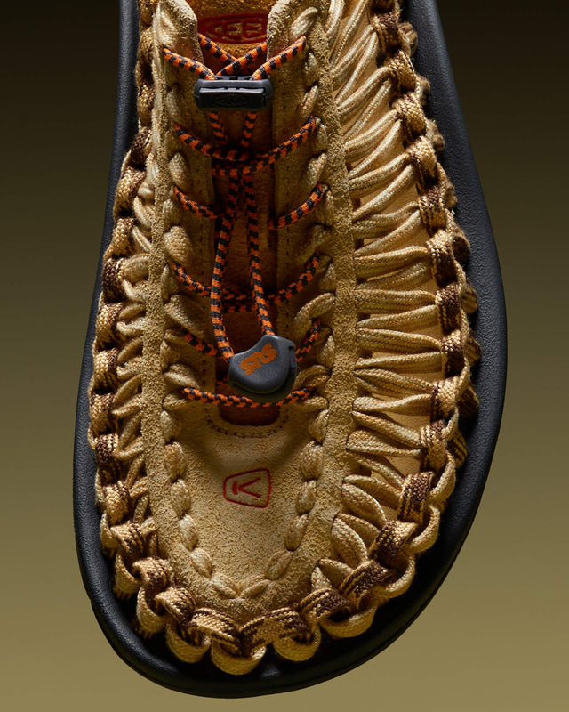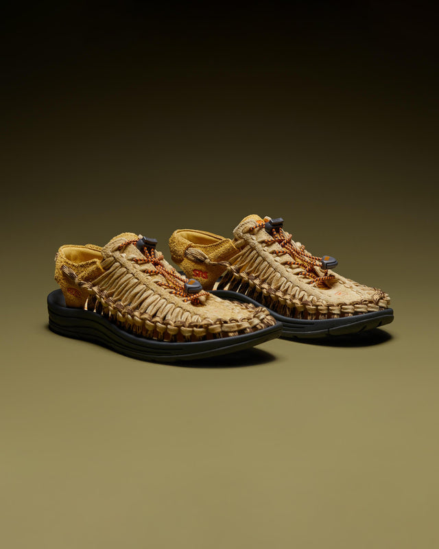 The SNS x KEEN UNEEK Flat takes cues from retro trek running silhouettes and adapts an exploration-ready design for the streets, combining a plush mammoth suede upper with an adjustable lace toggle for easy on-and-off access, complemented by the Water Resistant and NXT Cleansport Treatment on the footbed and durable rubber outsole.