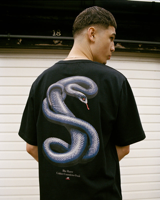 Inspired by the stunning blue-grey skin colors of the Blue Racer Snake, the lifestyle sneaker from New Balance is informed by heritage ‘70s running shoes and features a lightweight, breathable CORDURA® mesh upper with hairy suede overlays. Highlighted by faux Blue Racer snakeskin accents on the “N” emblem and heel tab, the SNS logo shares placement with the New Balance logo on each tongue. To go along with the shoes, both brands team up for a vast capsule clothing collection, including two graphic tees and a tracksuit equipped with signature snake print, while the cotton hoodie and cotton sweatpants, as well as the Rain Half Zip jacket, feature co-branded SNS x New Balance artworks.