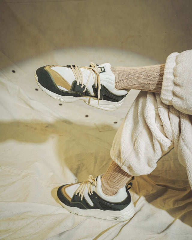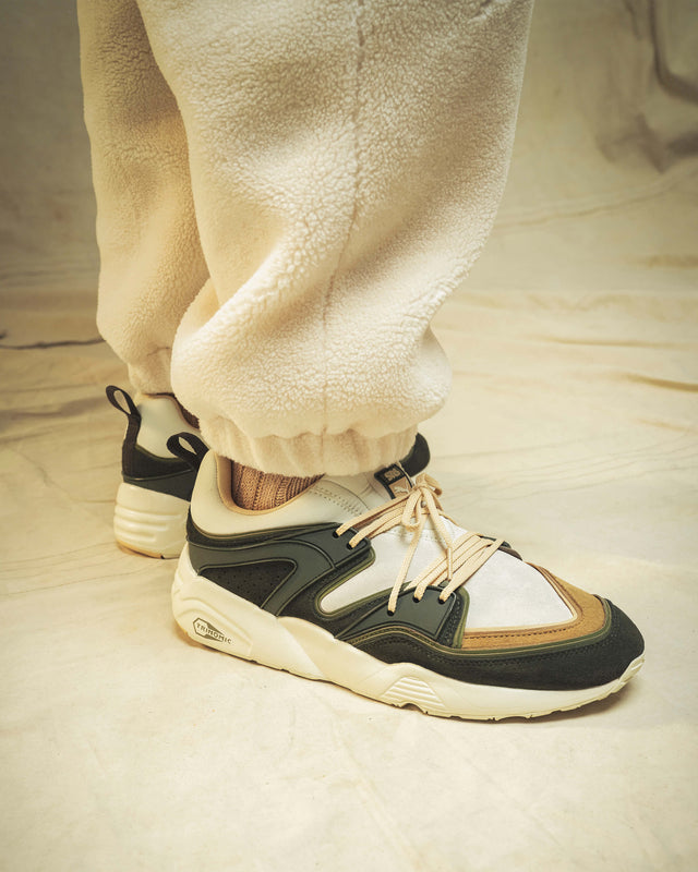 With the return of the PUMA Blaze of Glory in 2022, SNS was invited to rework the iconic mid-2000s sneaker offering their take on the PUMA DISC Blaze-inspired shoe. Crafted with a layered blend of leather and suede on the upper in several shades of earthy green tones, this premium version of the OG favorite features a premium tongue label, co-branded elements, and signature TRINOMIC technology.