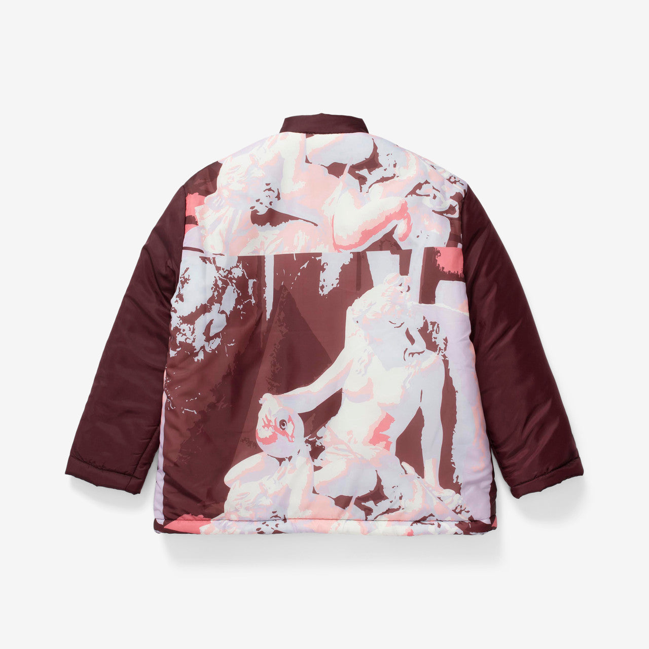The Junko jacket by Copenhagen-based brand OpéraSPORT features an eye-catching printed design on the back, inspired by the sculptures that adorn both Copenhagen and Paris in pink and purple hues. This denim bomber-style jacket has an oversized fit detailed with side pockets, full front zip, an elasticated bottom hem, and a tall collar.