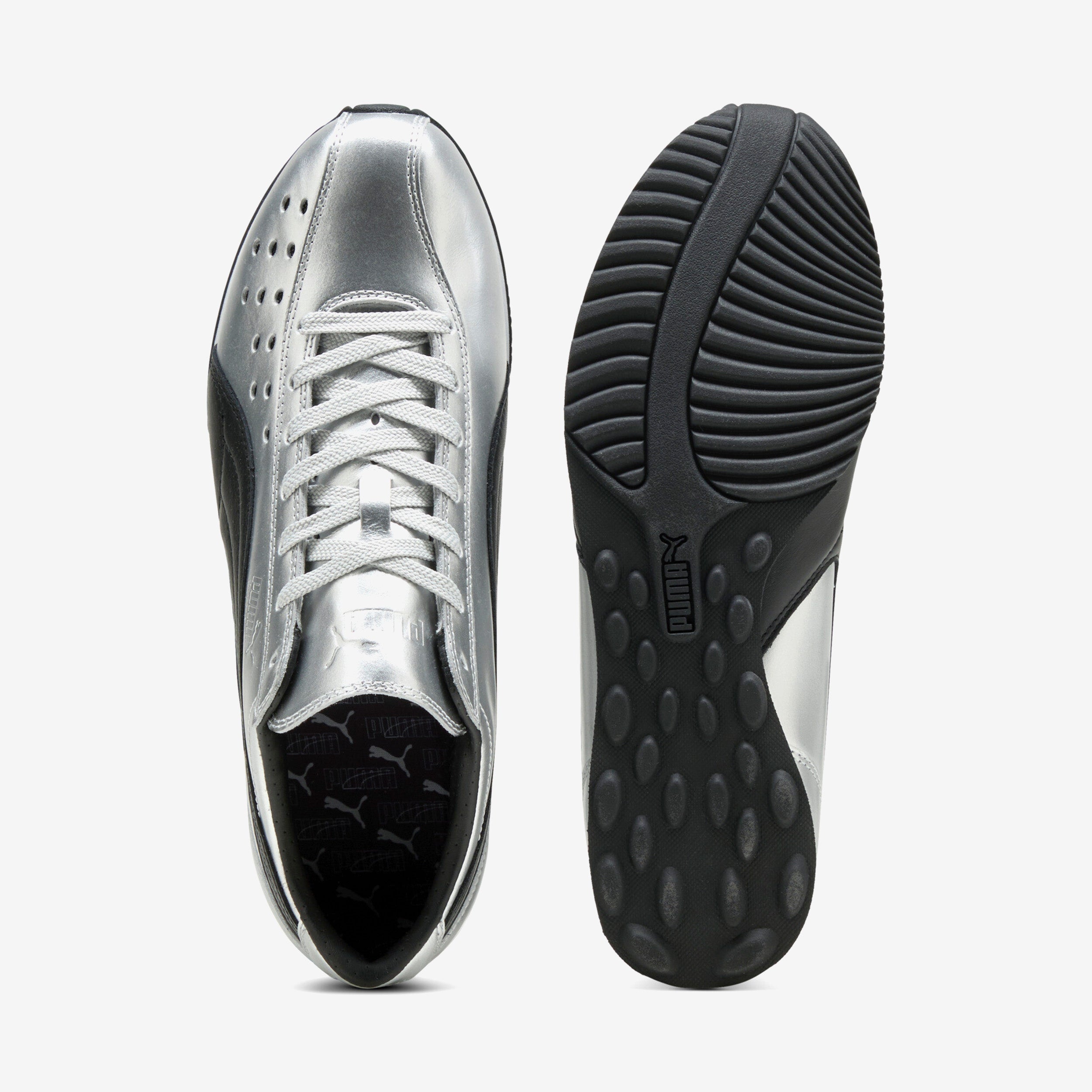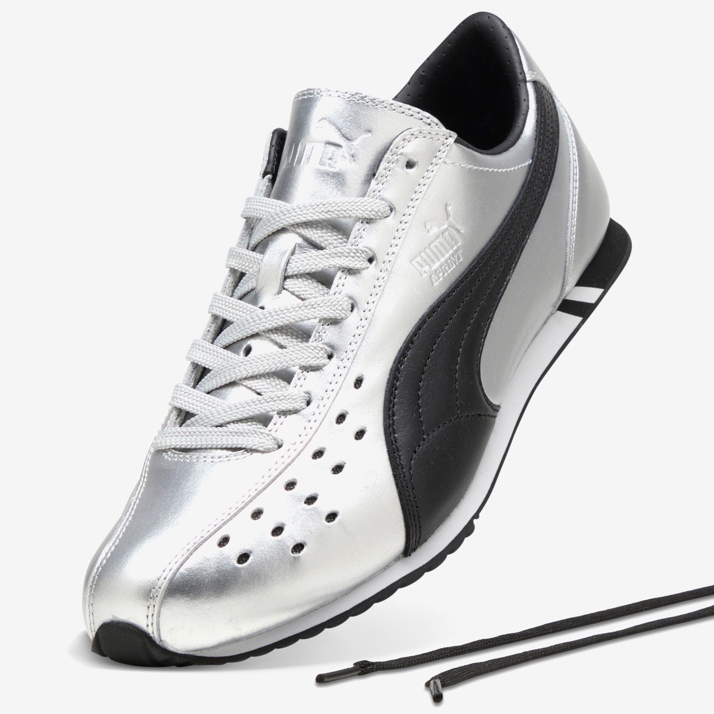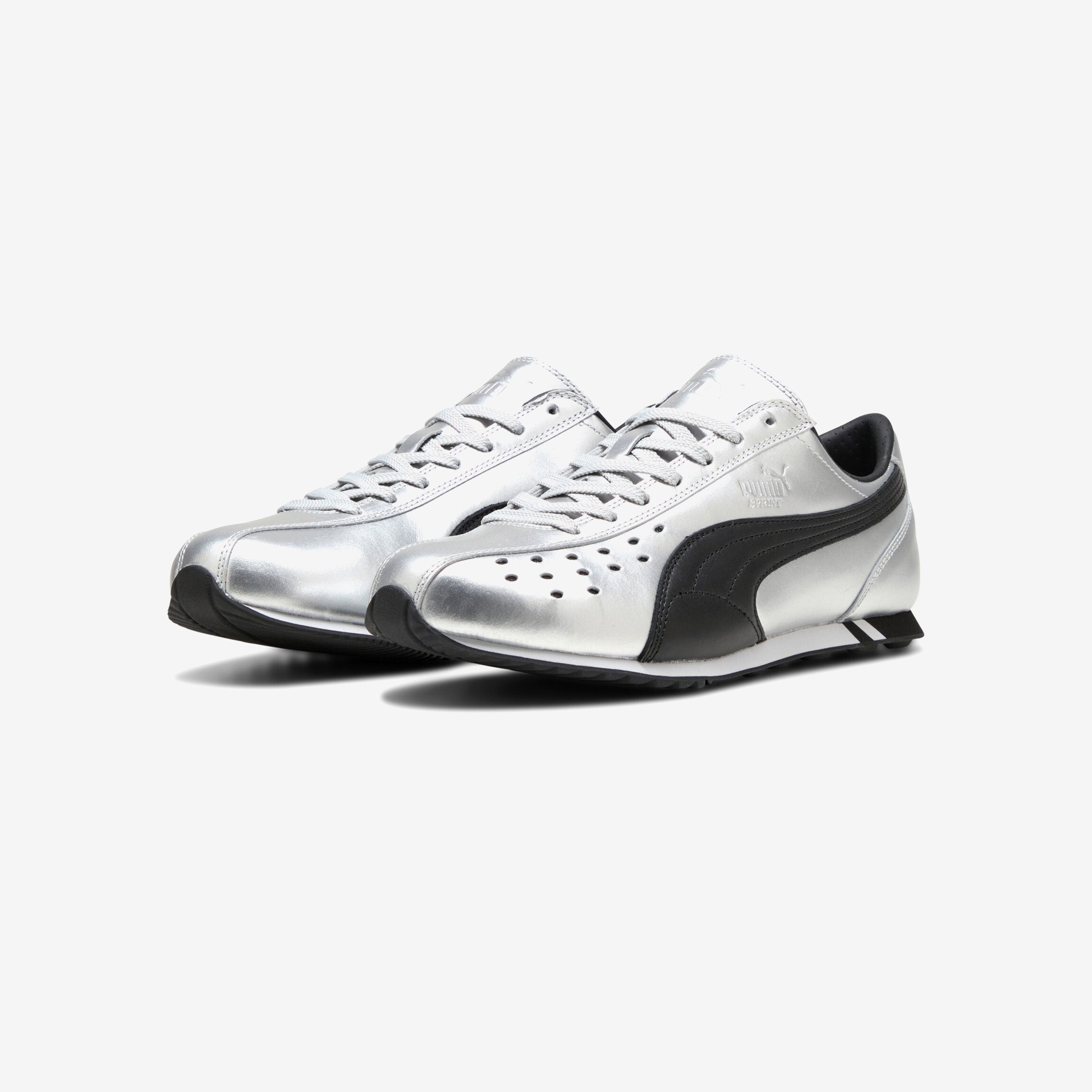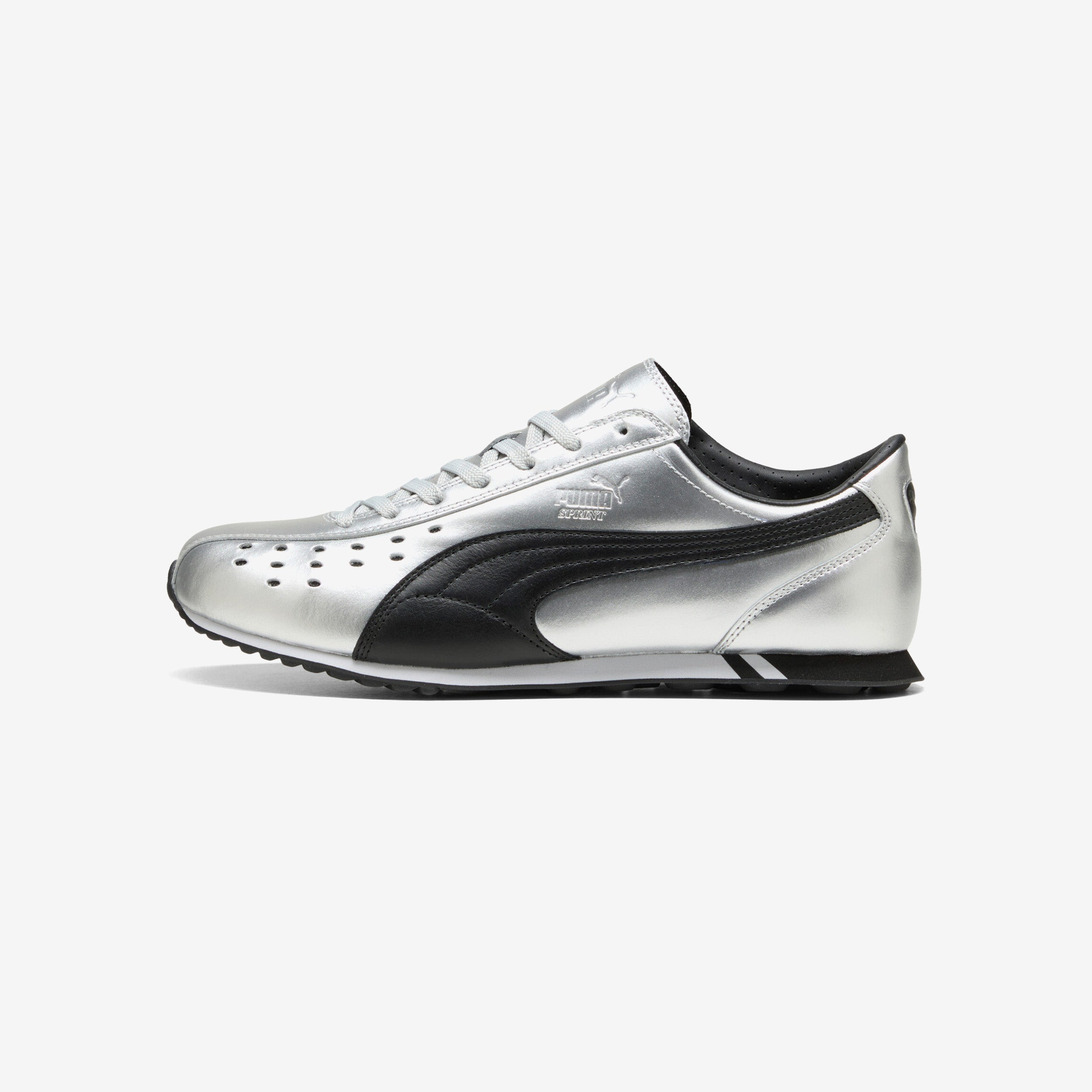 Born in the 2000s as a running shoe, the PUMA Sprint Metallic picks up the pace once again and makes its comeback into the streets. This hidden gem features a cutting-edge metallic leather upper with perforations on the side for extra breathability, a sleek, rounded toe area, and signature PUMA logos atop a durable, race-ready rubber sole.