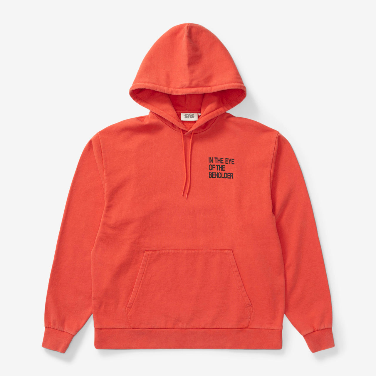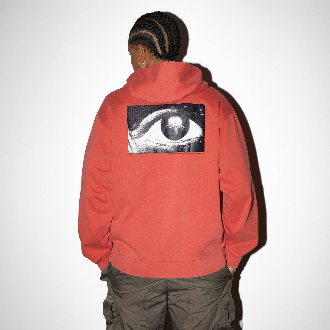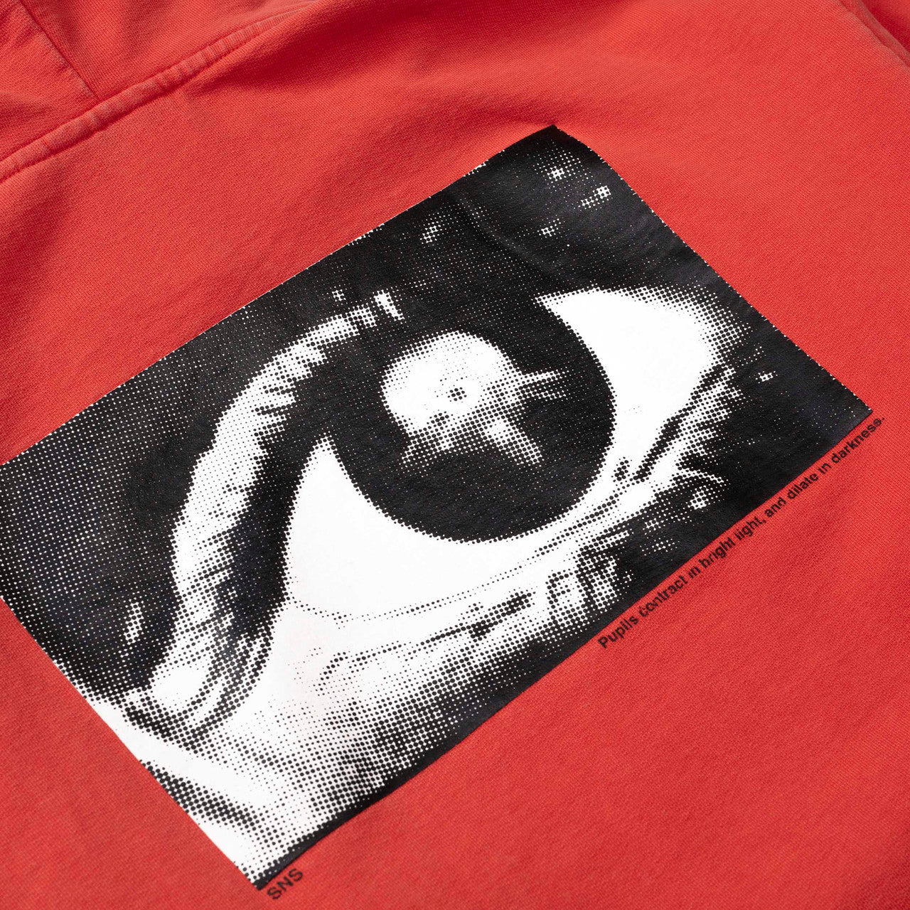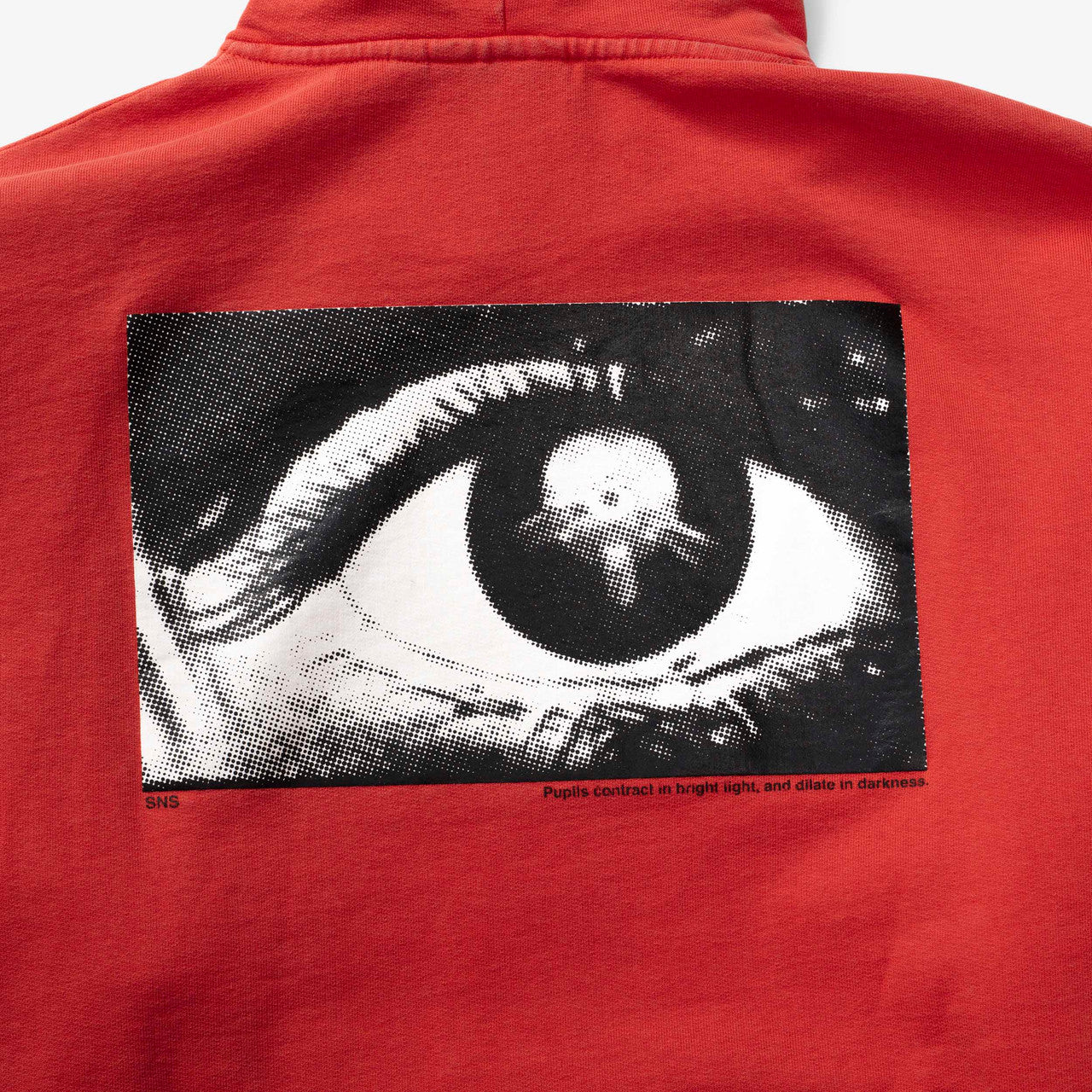 Crafted from premium Portuguese-made GOTS organic cotton, the SNS Eye Hoodie has a washed red colorway with a left-chest “IN THE EYE OF THE BEHOLDER” print and an “EYE” photo print at the back. The long-sleeved hooded sweatshirt features a drawstring hood and kangaroo pocket with elastic finishes at the cuffs and hem.
